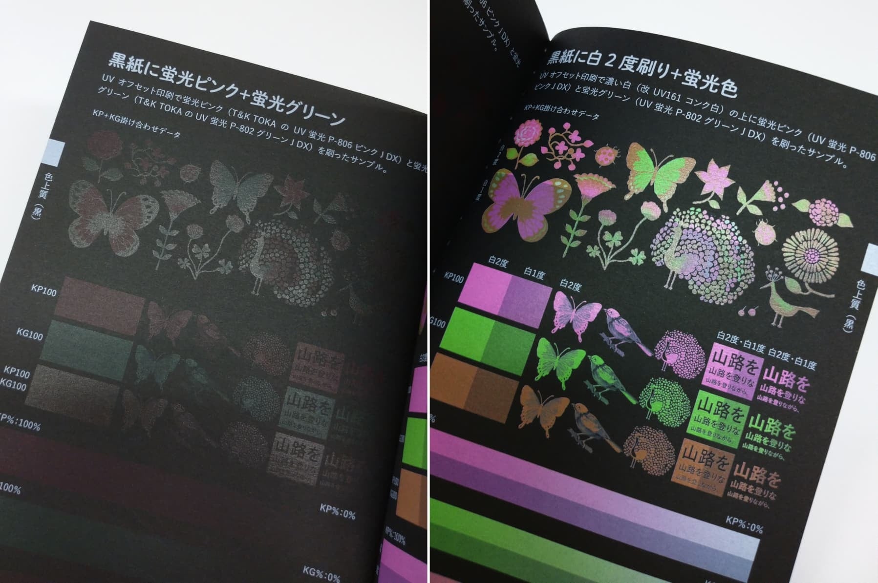 別冊見本帳には、UVオフでの白刷りのサンプルもあります。例えば、未晒クラフト紙と黒の色上質紙に、蛍光ピンクと蛍光グリーンだけを刷ったサンプルと、その下に白を1度/2度刷ったサンプルなど。白を有効に使うと、シルクスクリーンのような印刷に!