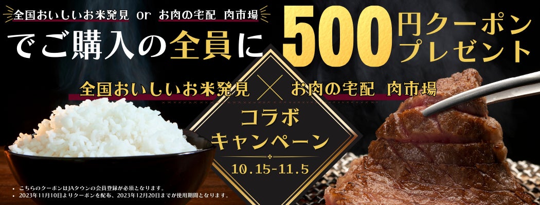 このキャンペーンは、新米と11月29日(いい肉の日)に合わせ、「全国おいしいお米発見」で商品を購入した方には「お肉の宅配 肉市場」で後日使用できる500円引きクーポン、「お肉の宅配 肉市場」で商品を購入した方には「全国おいしいお米発見」で後日使用できる500円引きクーポンをプレゼントします。