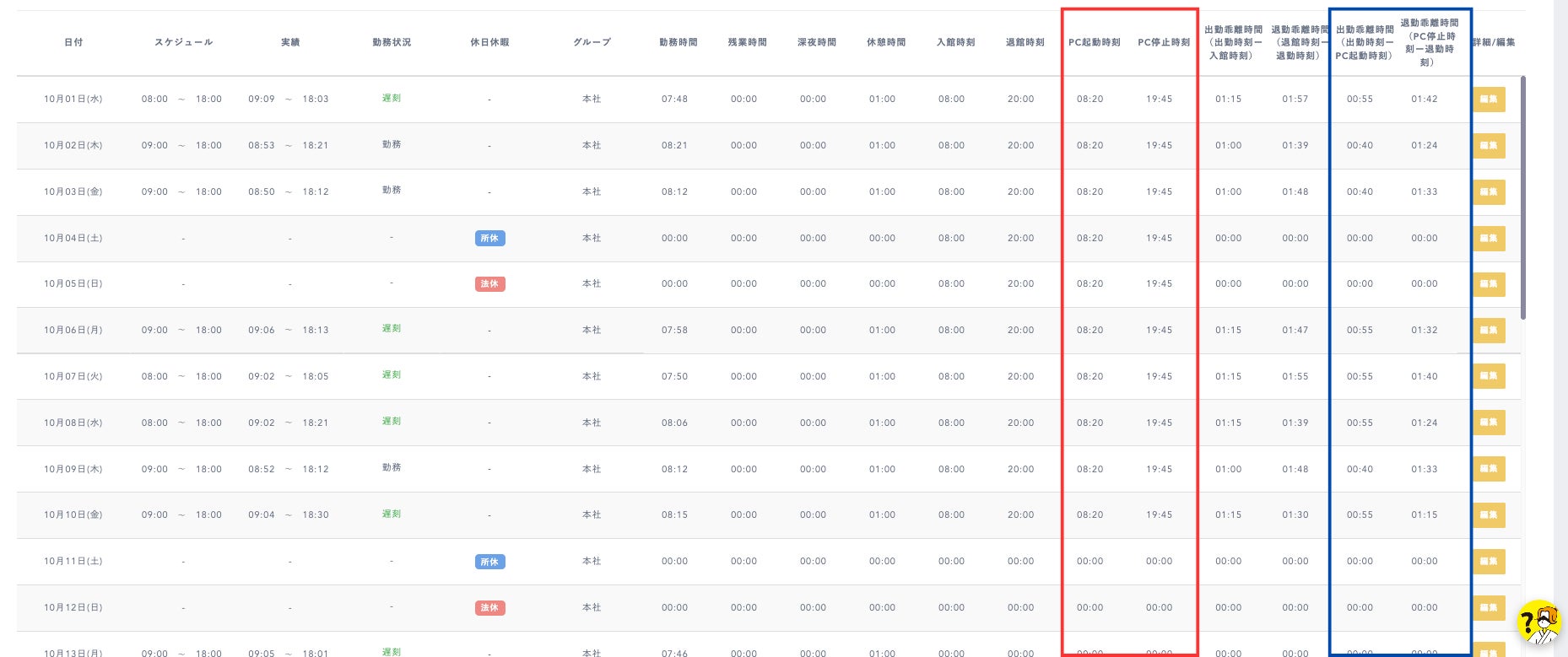 赤枠の箇所にて、「ez-PCLogger」を通して取得したPCの起動・停止時刻を確認できます。また、青枠の箇所にて、PC起動・停止時刻と「ジンジャー勤怠」での出退勤時刻の差異を確認することが可能です。