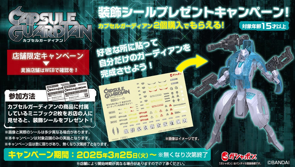 3月25日(火)より店舗限定キャンペーンが実施されます。全国のカプセルトイ専門店の一部店舗にて、「カプセルガーディアン」の商品に付属のミニブック2枚をお店の人に見せると、「カプセルガーディアン」に貼って楽しめる装飾シール1枚をプレゼントします。