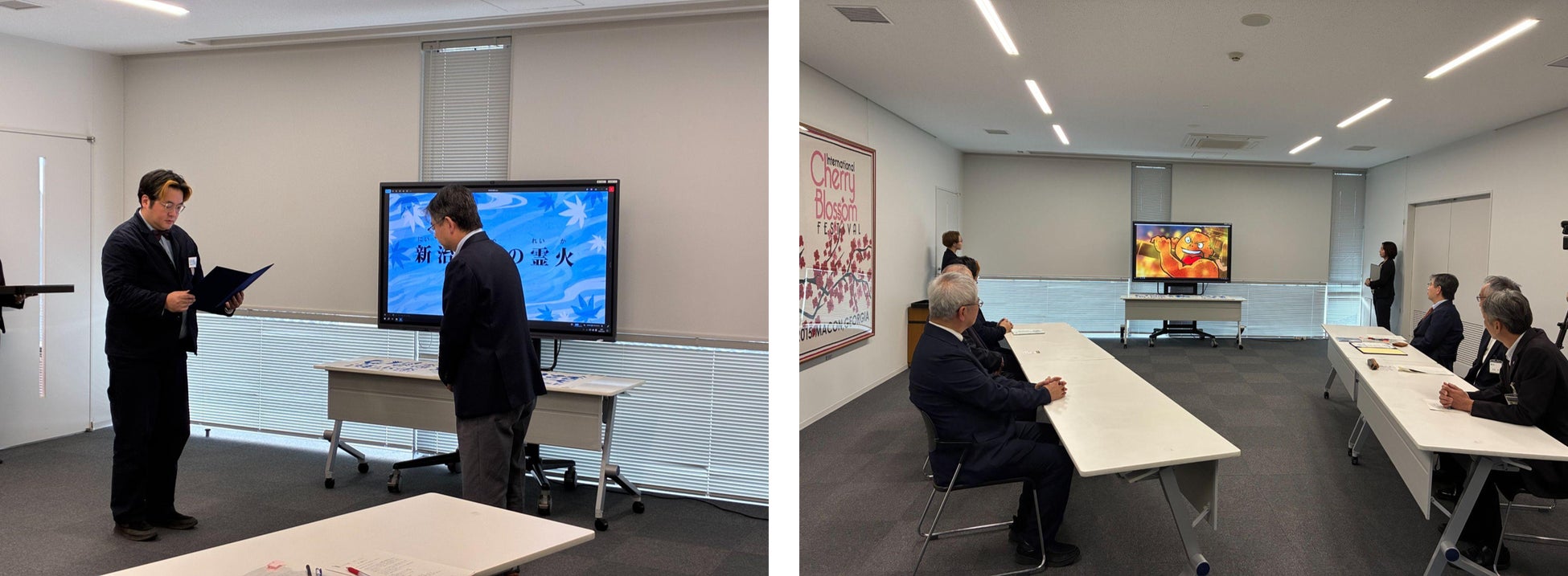 ●司会挨拶 ●海ノ民話のまちプロジェクト説明 ●認定証・完成アニメパッケージ贈呈 ●フォトセッション ●海ノ民話アニメーション上映 ●会談 ・感想などフリートーク ・上映会と地域連携企画の予定 ・アニメの活用、展開についてフリートーク ●取材(首長) ・海ノ民話アニメーションの感想 ・地域における活用構想など ●取材(沼田監督) ・今回の作品に対する想い ・地域の皆様へのメッセージ ●個別取材 |