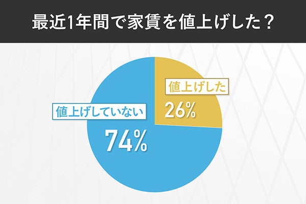 「直近1年以内で所有物件の家賃を上げたことがありますか」という問いに対し、「値上げした」が26%、「値上げしていない」が74%という結果になりました。