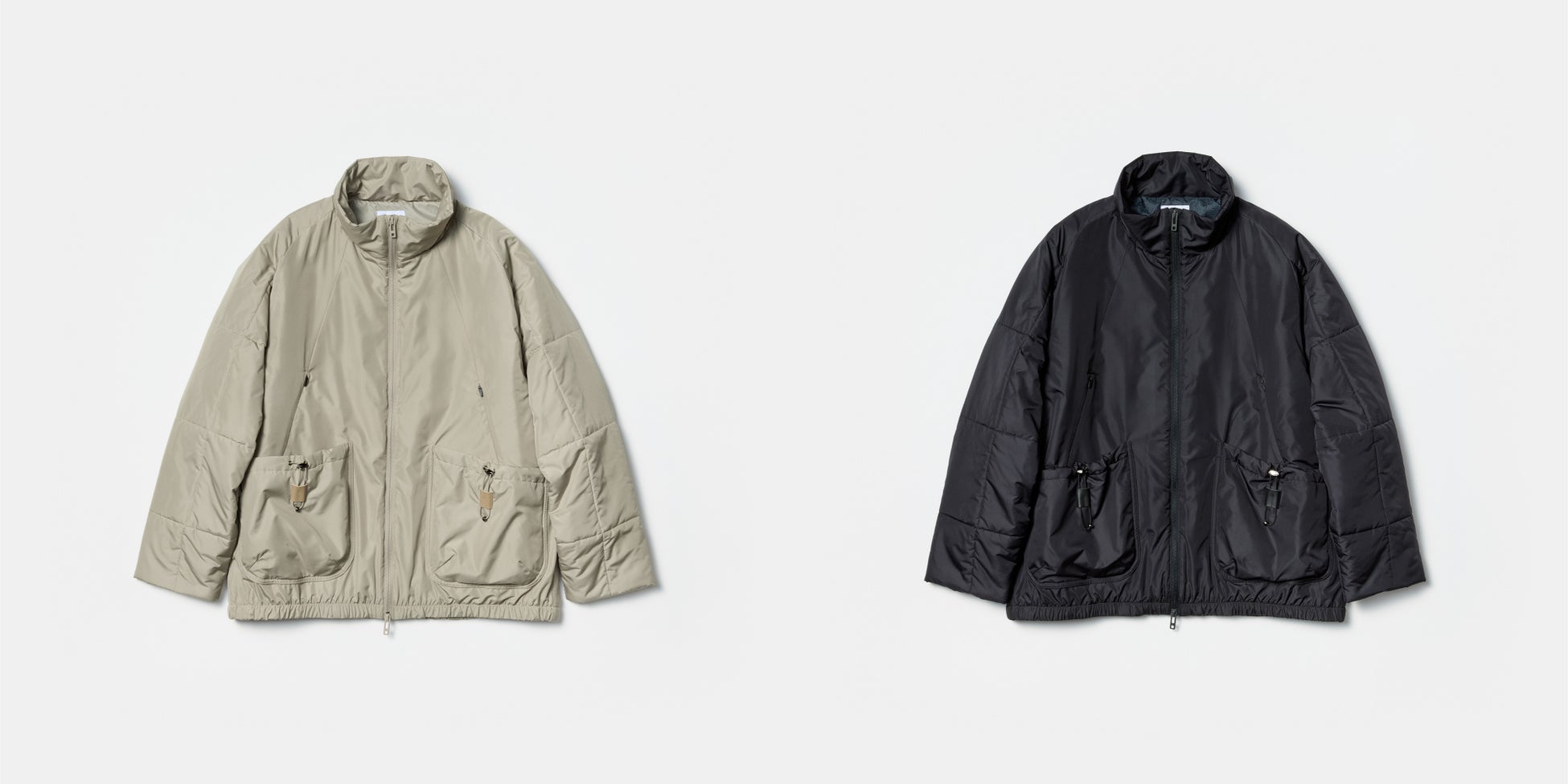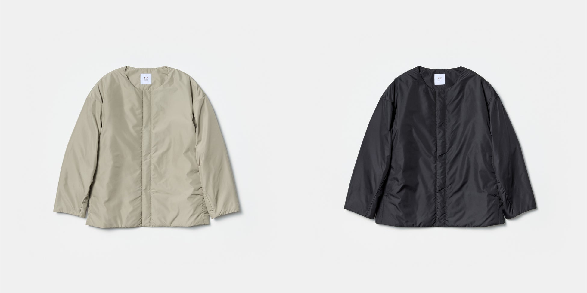 撥水加工を施した高密度タフタを使用した、ノーカラーの中綿ジャケット。