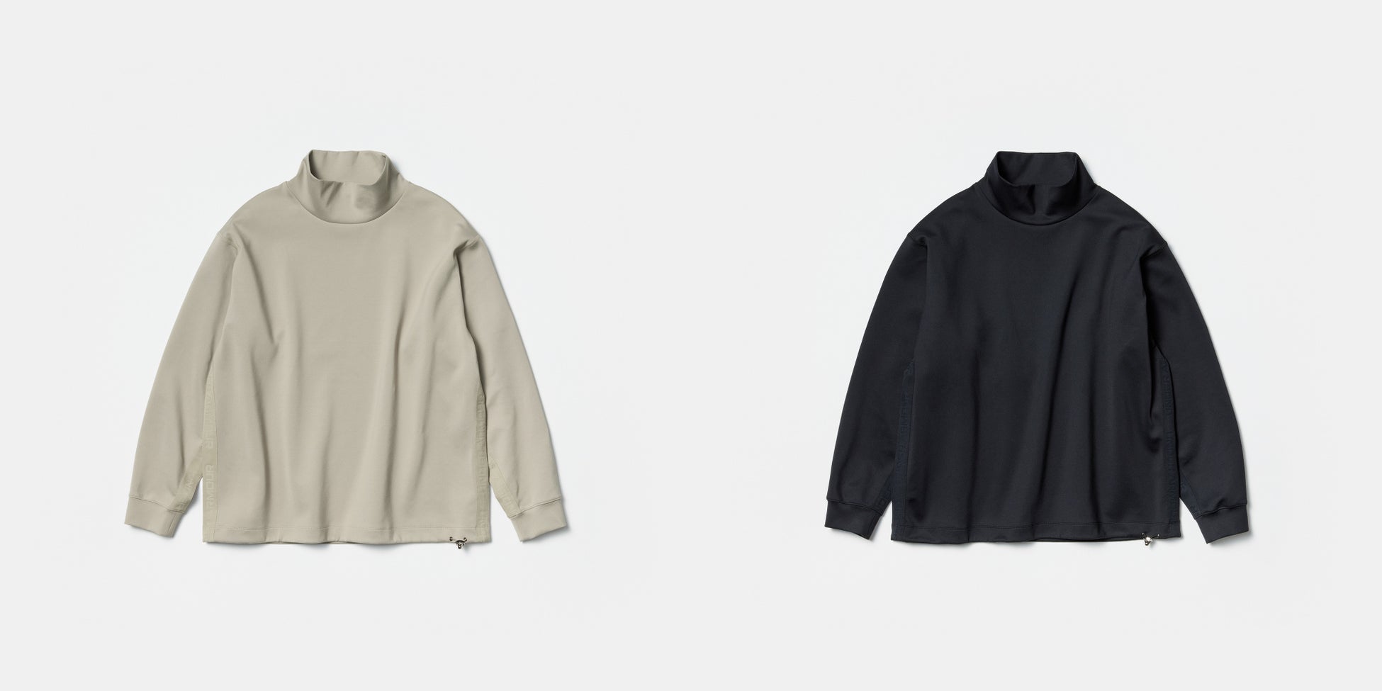 ややゆとりがあるシルエットのモックネックデザインのロングスリーブTシャツ。