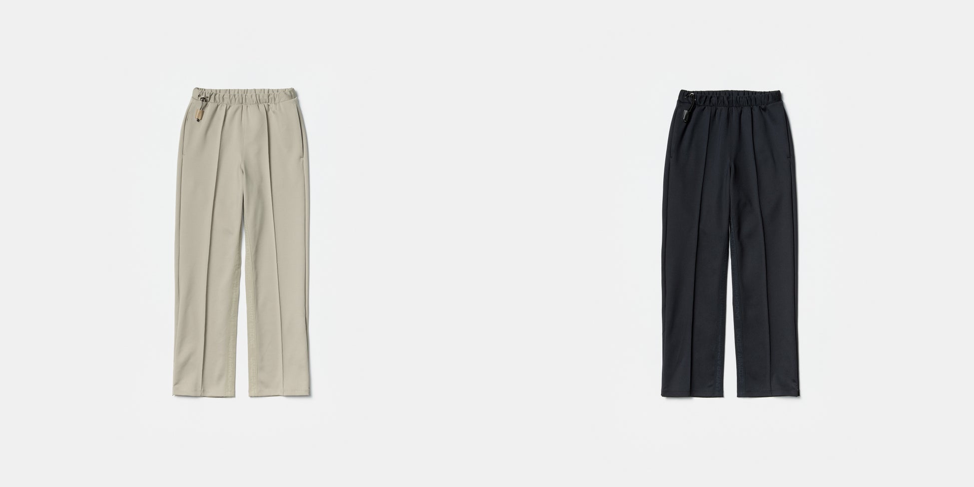 センターにクリースステッチ入りでスッキリ見え、インサイドシームにたたきつけた同系色のロゴテープがアクセントになっています。