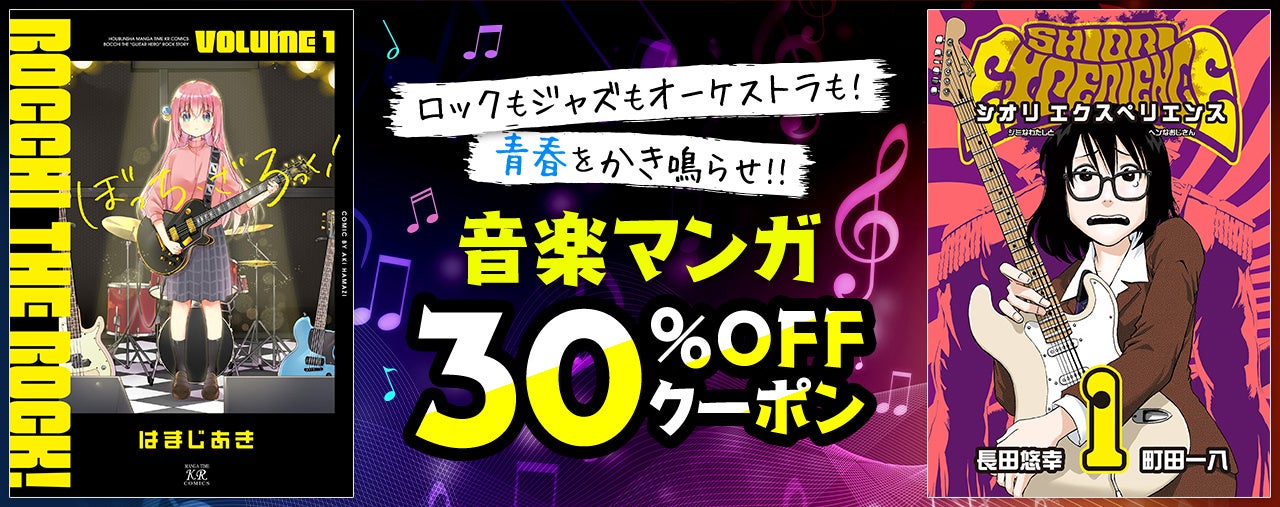 TVアニメ化でも話題沸騰の女子高生4人組ガールズバンド、2024年春には映画公開も決定した『ぼっち・ざ・ろっく!』。音楽シーンの圧倒的な表現力でジャズプレーヤーを目指す青年を描き、待望のアニメ映画が公開中の『BLUE GIANT』。TVアニメ絶賛放送中、個性豊かな仲間たちと高校のオーケストラ部の世界を描く、アンサンブル青春ドラマ『青のオーケストラ』。ロックを中心とした作品から、TVアニメ化や映画化で話題の作品まで、今読んでほしい音楽マンガを厳選いたしました。また、対象の作品に使える30%OFFクーポンも配布いたします。ぜひこの機会にお楽しみください。