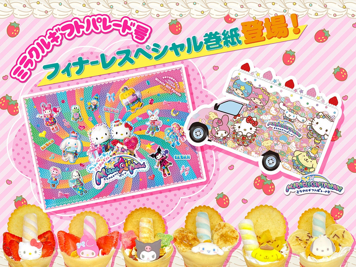 さらに、全国のイベント会場などで展開されるサンリオカフェワゴン「ミラクルギフトパレード号」限定で、「Miracle Gift Parade」フィナーレスぺシャルデザインのクレープ巻紙が登場。思わず写真を撮りたくなるカラフル&ポップなワゴンと、キュートなスイーツはフィナーレの思い出にぴったりです。