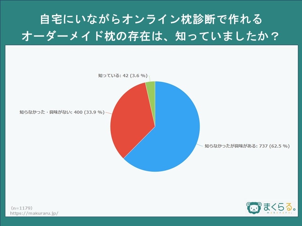 自宅に居ながらオンラインで作れるオーダーメイド枕の認知度は 3.6%と低い一方、興味がある人は 62.5% と関心が高い結果に。背景に店舗での購入不安か。オーダーメイド枕の情報メディア「まくらる」調べ