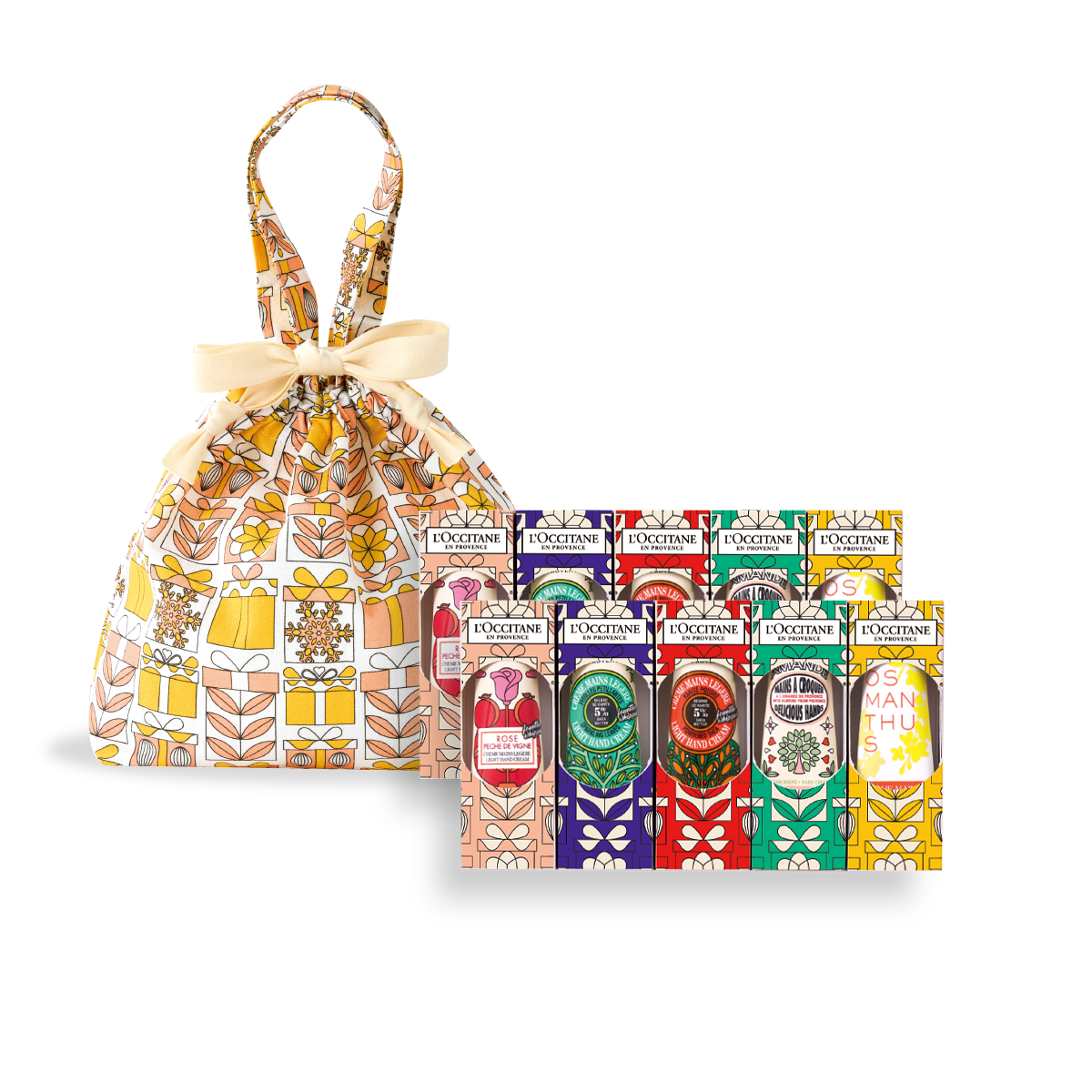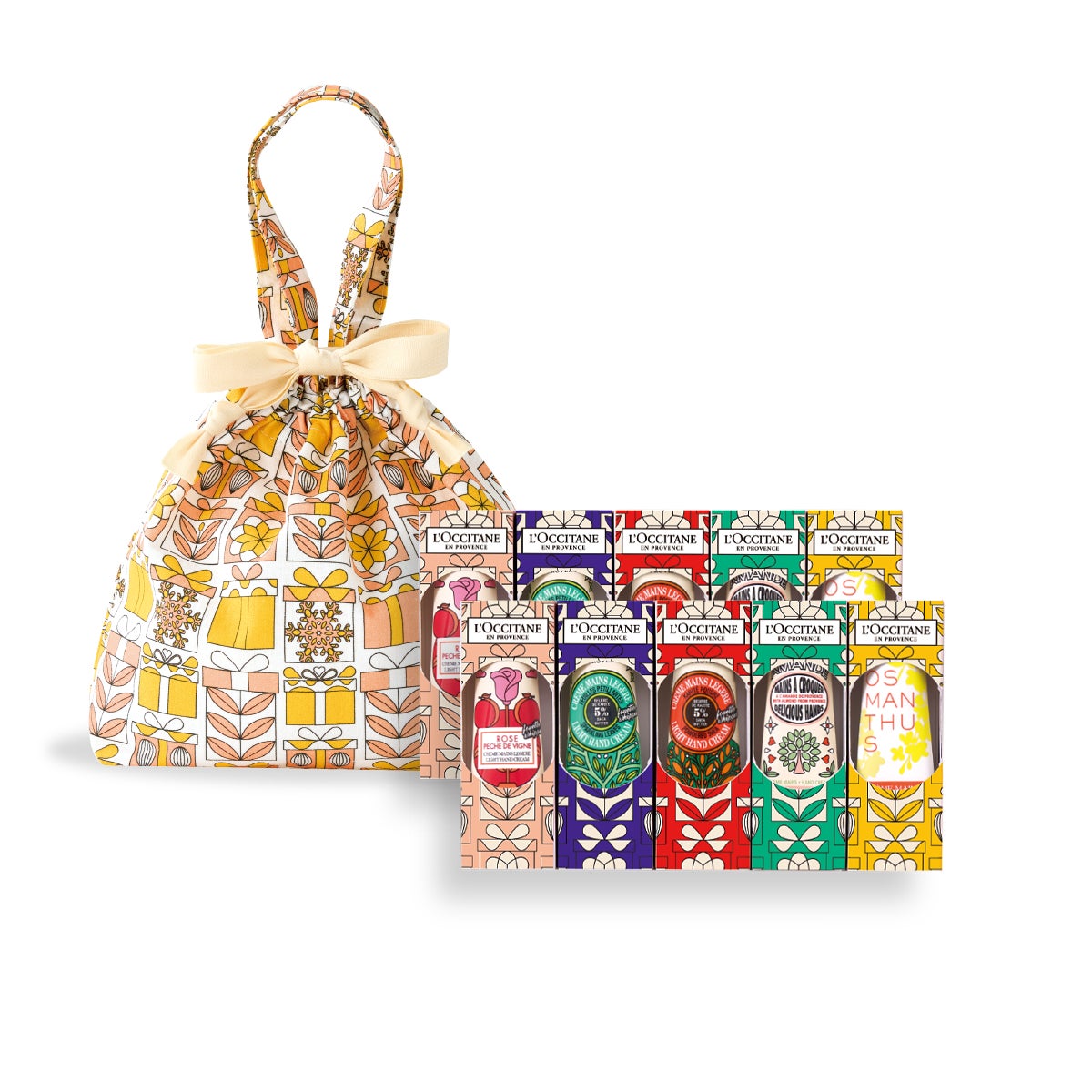また、1本1本が個包装されていて配りやすい10本セットの「ハンドクリーム GIFT FOR ALL」も登場中。ホリデーコレクションの4つの香りの他、金木犀とフレッシュなアプリコットやラ・フランスが香る「オスマンサス」を加えた5つの香りのミニハンドクリームが各2本入った10本セット。ひとつひとつを個別にかわいくパッケージしているので、プレゼントにぴったりです。さらに今年は可愛いホリデーデザインの巾着袋に入っています。