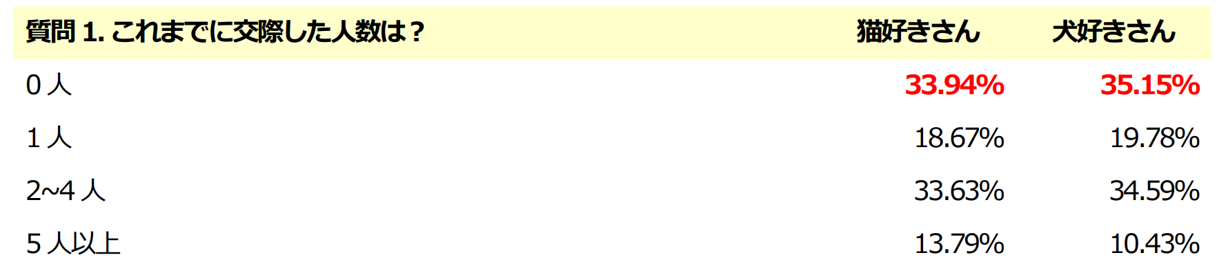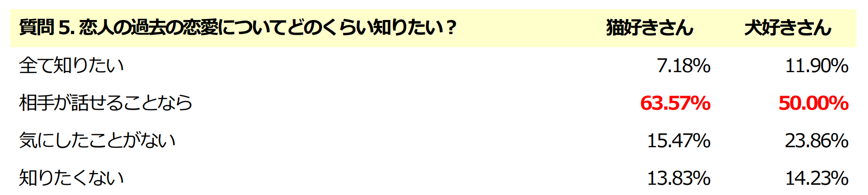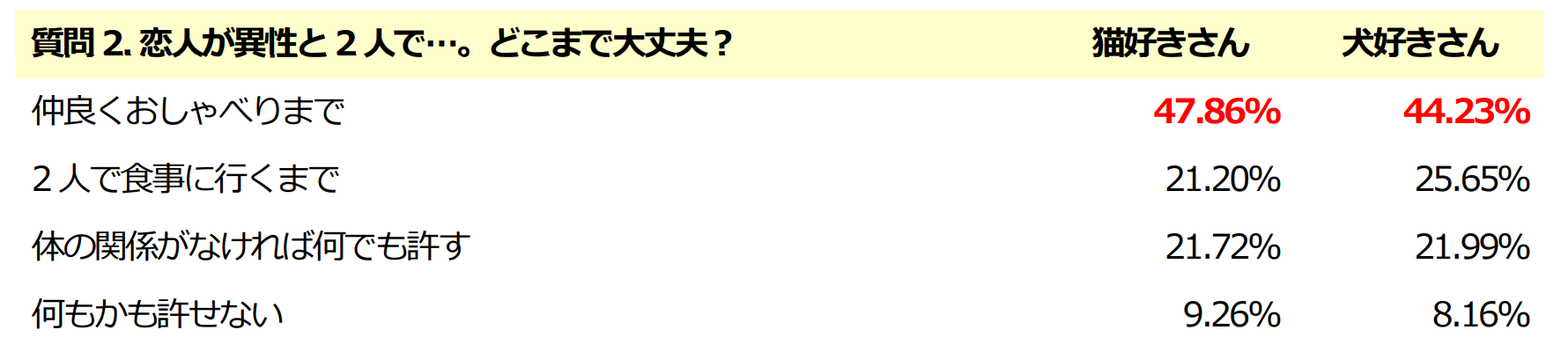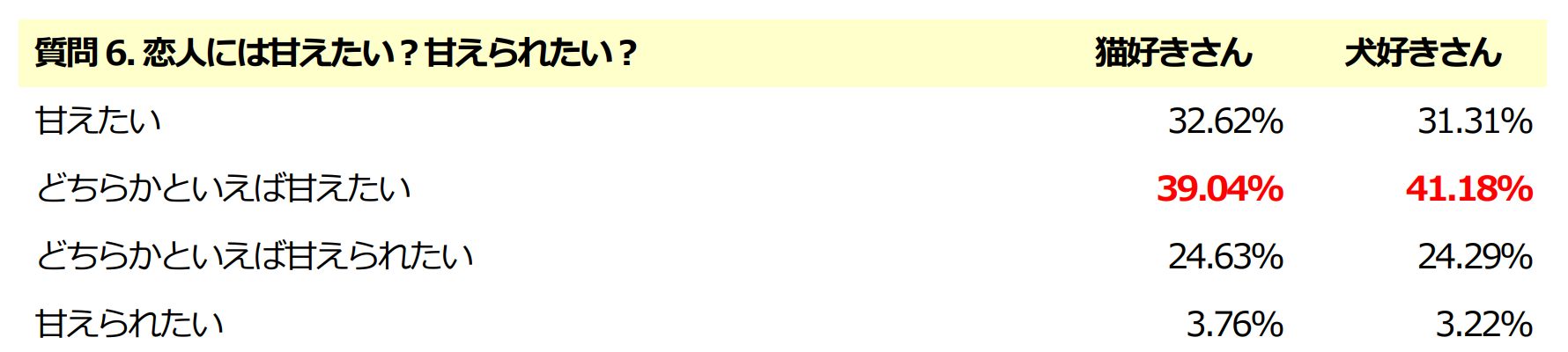 今回のアンケートでは、一般的に思われているような「猫好きさんは猫と同じく恋愛はマイペース」、「犬好きさんは犬が飼い主を慕うように恋愛でも相手に甘えたり、尽くすタイプ」などのイメージに反し、猫好きの方と犬好きの方の恋愛傾向・思考には、びっくりするくらい”ほぼ差は無い”という結果となりました。