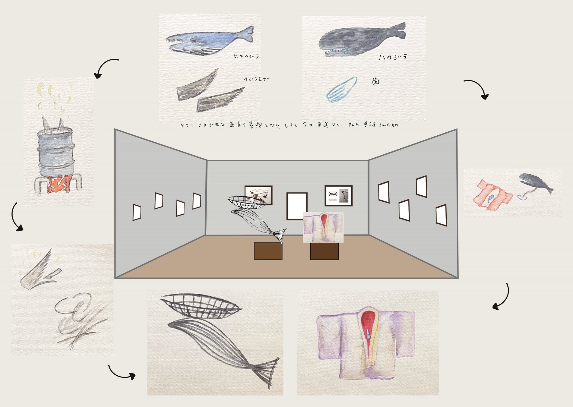 人と鯨の関わりを探り、さまざまな土地を訪れる中で、私の元にはかつて捕鯨で獲られた鯨に由来する素材が集まるようになった。それらは過去に多様な道具の材料となったが、現在では必要とされなくなっている。語りであれば文章や映像によって記録し、本や映像作品として残すこともできる。現代の生活から姿を消しつつある素材とその加工の技はどうしたら残されるだろう。私は空想の玩具を作ることで、語りと技術を共に残す道を模索する。