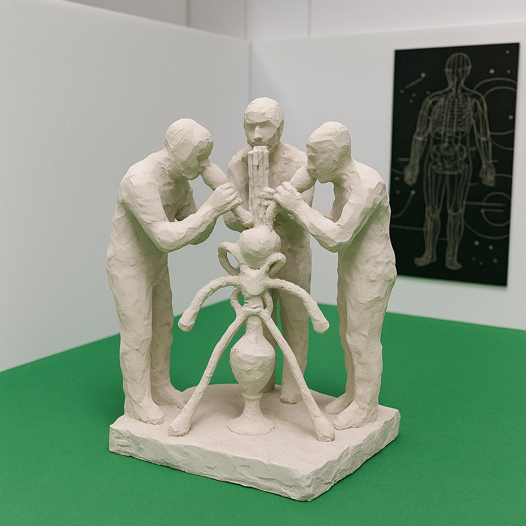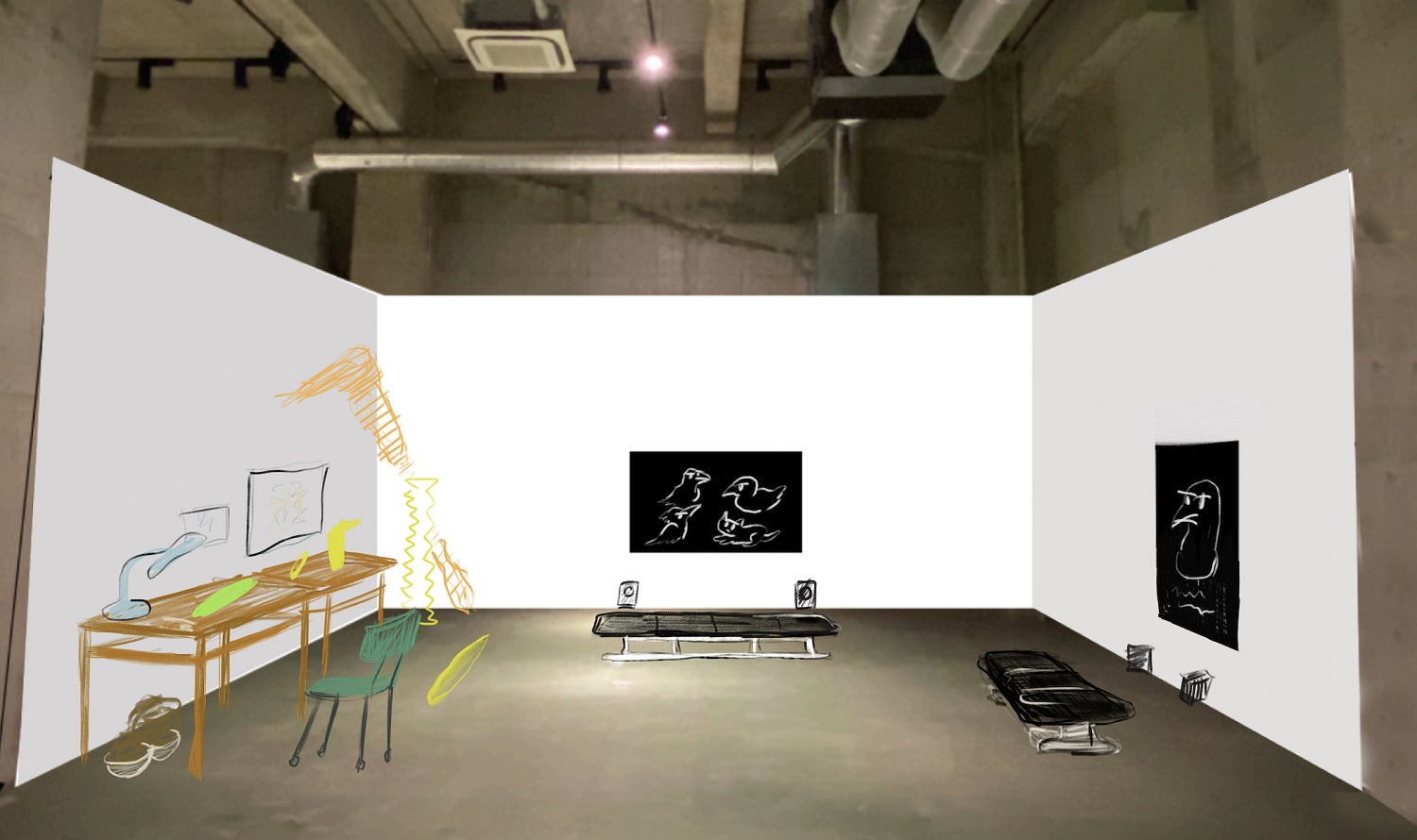 街に佇む、忘れられたか無視された幽霊のような存在に注目し、共感と反発のはざまで、その姿を描くように様々な調査を基に作品を制作しています。近年は特に、自身が学び制作の拠り所にしてきた「彫刻」について調査し、彫刻家を演じるビデオ作品を制作しています。今回は、戦後すぐの日本の彫刻の抽象表現の黎明期において、多くの彫刻家に参照されたブランクーシとその代表作である「空間の鳥」の解釈をめぐる彫刻家たちによる話し合いを演じます。