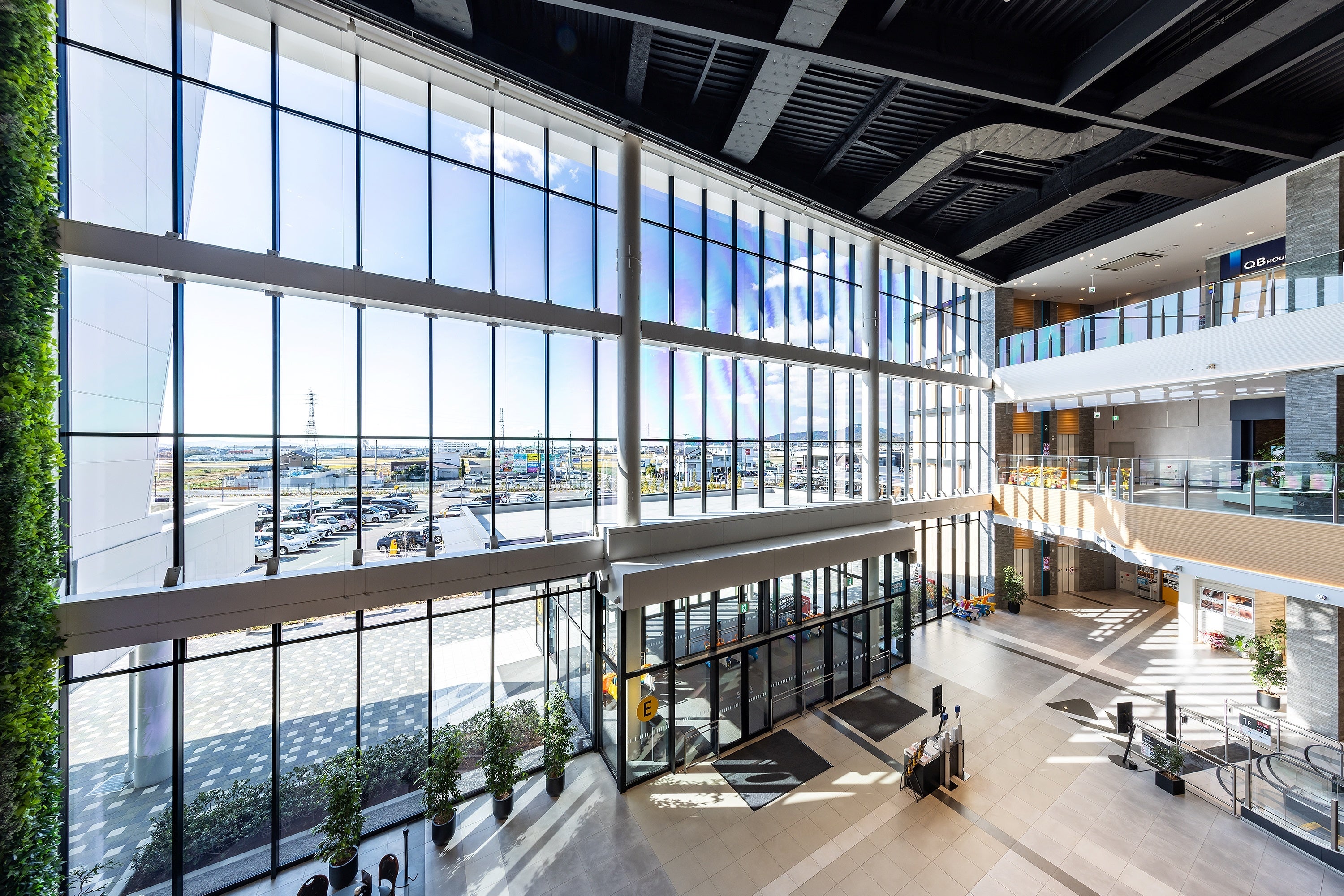 これを改善すべくイオンモール豊川は公共性を重視して、開口を最大化することで商業本来の店を、見せ、魅せる意図が読み取れる大胆な開口をデザインした。最近の商業施設はパークPFIを活用した公園や緑地を併設するなど、商業用途以外の様々な活動やイベントと連携して施設内外をつなぐなどその関係性を良好なものにする事例が散見できる。多くの商業施設が衰退する現代において、開放性の高い商業施設、ショッピングモールとして施設内の様々なコンテンツを近隣街区に訴求して、更に外部から不特定多数の人々を大きな開口へ招き入れることは、経済性のみならず、地域社会の活性にも貢献する。それを可能にするのがフロントサッシ(店舗用建材)による開口部を最大化するデザインである。昨今商業施設の再活性化ニーズが高まる中、今後の複合商業施設の再開発モデルになり得ることが期待できる。こうした点を高く評価してグランプリに選定した。