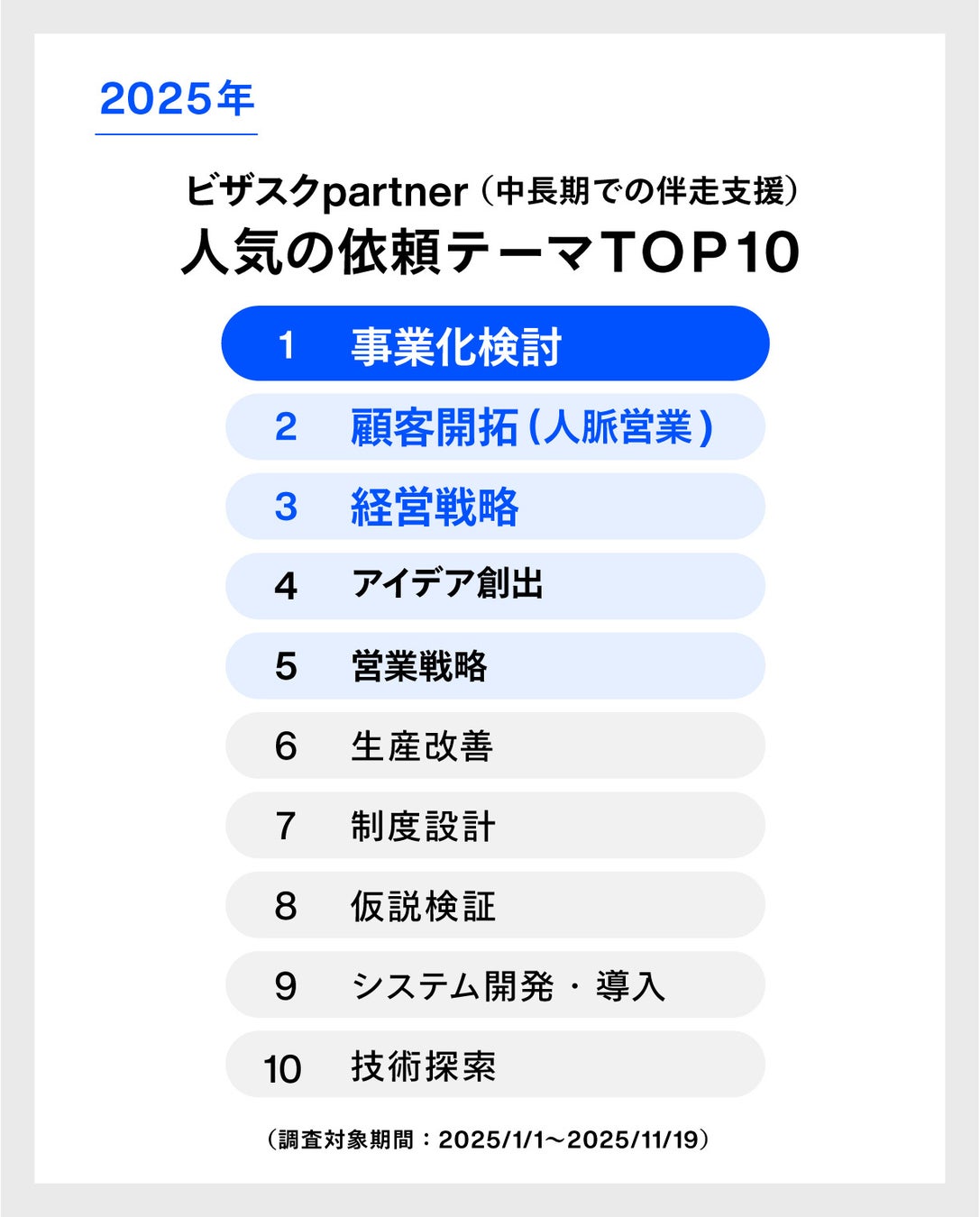 また、ビザスクpartner(中長期での業務委託・伴走支援)における人気の依頼テーマTOP10も発表します。