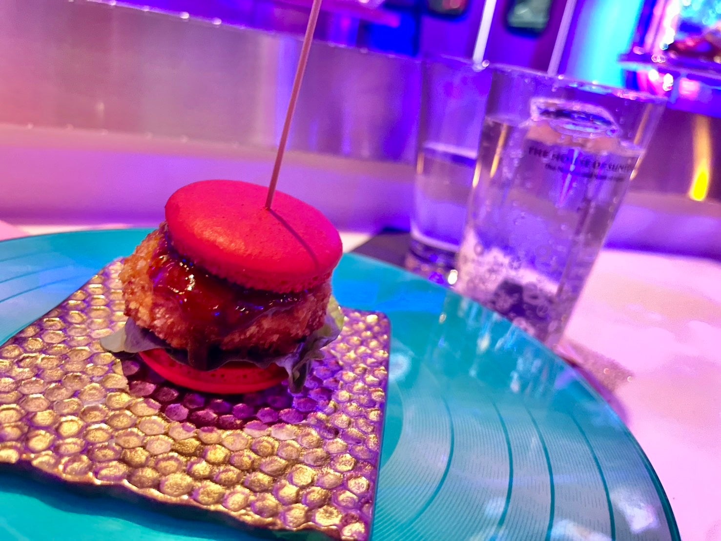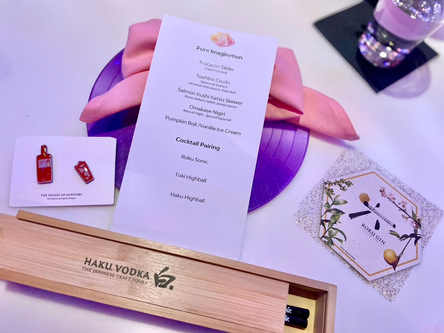 今回提供したコース『Pure imagination』は、ハンバーガーに見立てたマカロンスライダーと、前菜と相性が良い「ROKU(六)」ソニックに桜の花と金粉を添えた、見た目も風味も華やかなペアリングからスタート。刺身や串揚げなどの伝統的な日本食には、伝統あるサントリーのハイボールを「TOKI(季)」で。添えられたグレープフルーツの香りや、トーストココナッツ「TOKI(季)」のアトマイザーで変化を楽しみます。メインの寿司には、シャリと同じく米を原料とする「HAKU(白)」のハイボールを合わせ、白米の清らかさを存分に感じながら、途中でガリを追加する演出も。