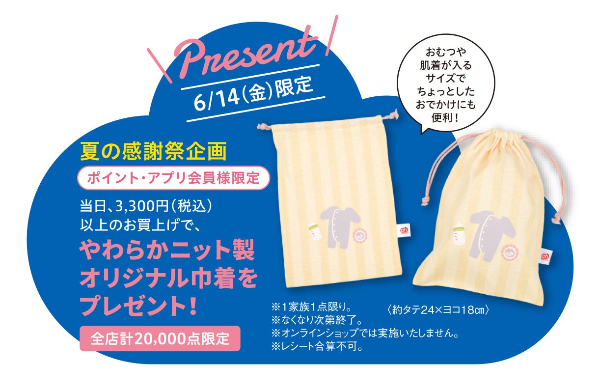 ポイント・アプリ会員様限定。 ~夏の感謝祭企画~当日3,300円(税込)以上のお買上げで「やわらかニット製オリジナル巾着」をプレゼント!おむつや肌着が入るサイズでちょっとしたおでかけにも便利です!