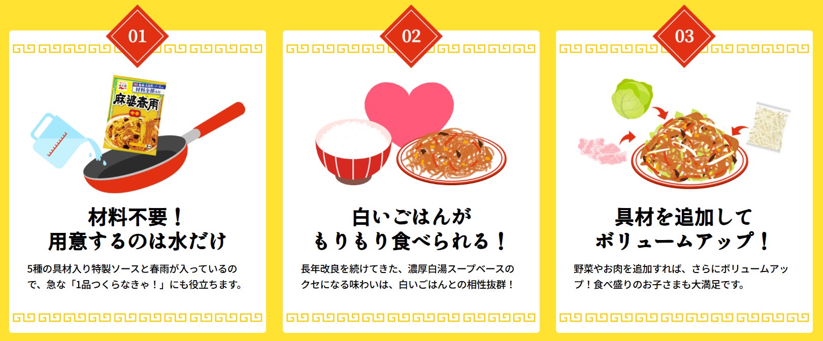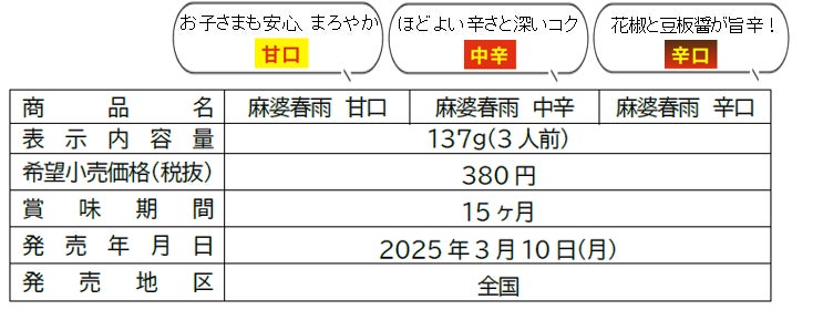 5分間の簡単調理でできる、白いごはんがとまらないおかずの素「麻婆春雨」が今年発売44年目をむかえ、発売以来初めての縦型の新パッケージにリニューアル!おいしさや出来上がりの量はそのまま、初めて手に取るお客様にも“材料全部入り”が伝わるデザインと、商品選びの楽しさをご提供するため売場に数多く並べられる商品形態となりました。