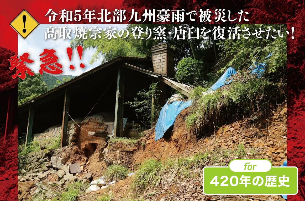 2023年7月10日の豪雨災害で被害を受けた、福岡県東峰村の髙取焼宗家の登り窯と唐臼を復活させ、代々受け継がれてきた技法と文化を守ることを目指す緊急支援プロジェクトです。