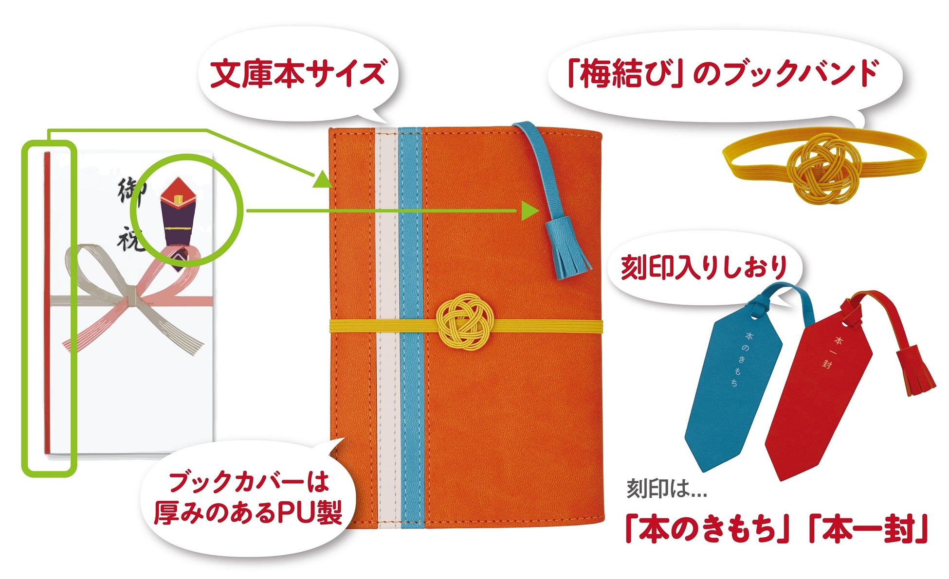 “お祝い”というテーマにちなみ、日本のお祝いシーンで渡される「ご祝儀袋」をモチーフに、各所におめでたいデザインを散りばめました。ブックカバー表側の2色の縦のラインは、ご祝儀袋の紙の重ね目をイメージし、ブックバンドには慶事に用いられる梅結びの水引が付いています。また、しおりはご祝儀袋や熨斗紙に付ける飾りの「のし」を模していて、カラーごとに「本一封」「本のきもち」といった“本と贈る言葉”をかけた刻印が施されています。