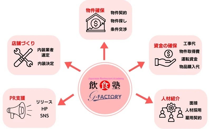 物件紹介を含めた新規開業のお悩みをまるごとサポート、卒業後に現場で感じた壁を解決するプライベートレッスンの実施、開業前の腕試しができる場を提供、など卒業後の活躍をもっと応援できる体制が整っています。飲食塾だけではなく、ミシュラン星獲得店をはじめとした飲食店を運営しているノウハウを生かし、これまで1000店舗以上の飲食企業などの開業・出店をサポートしてまいりました。飲食塾の卒業生の出店開業も力強くサポートします!