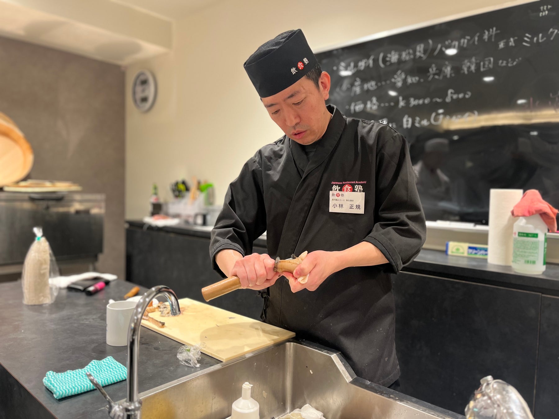 寿司職人歴は20年以上で、チェーン店、個人店、老舗、ホテルなどさまざまな店舗で経験を積み、現在は飲食塾にて3カ月という短期間でプロの寿司職人を育成。