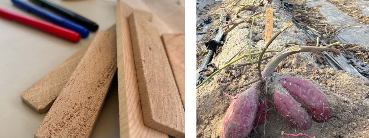 苗植え体験を行った際、名古屋地区の建築現場から出るフローリングの端材を活用して、名前や好きな絵を描いてもらったネームプレートを作成していました。今回はその自分のネームプレートを目印に自分が植えたさつまいもを探し、収穫しました。