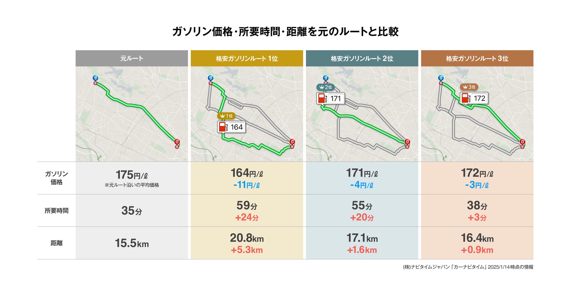株式会社ナビタイムジャパン(代表取締役社長:大西 啓介、本社:東京都港区)は、2025年1月16日(木)より、カーナビアプリ『カーナビタイム』にて出発地から目的地までの周辺のガソリン価格を考慮し、価格の安いガソリンスタンド※1を経由地としたルートを検索できる「格安ガソリンルート」検索機能を提供開始いたします。