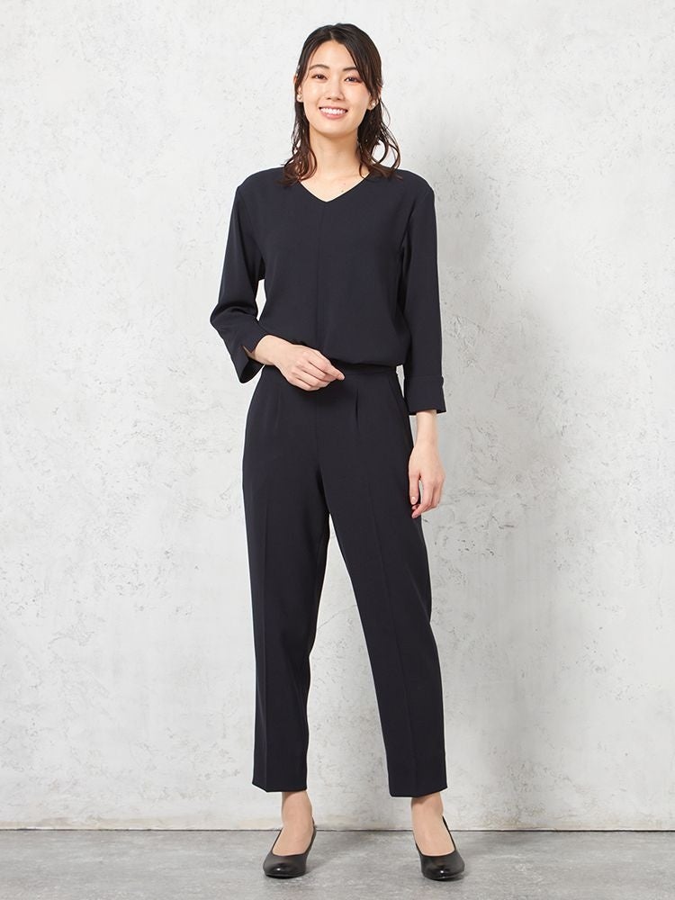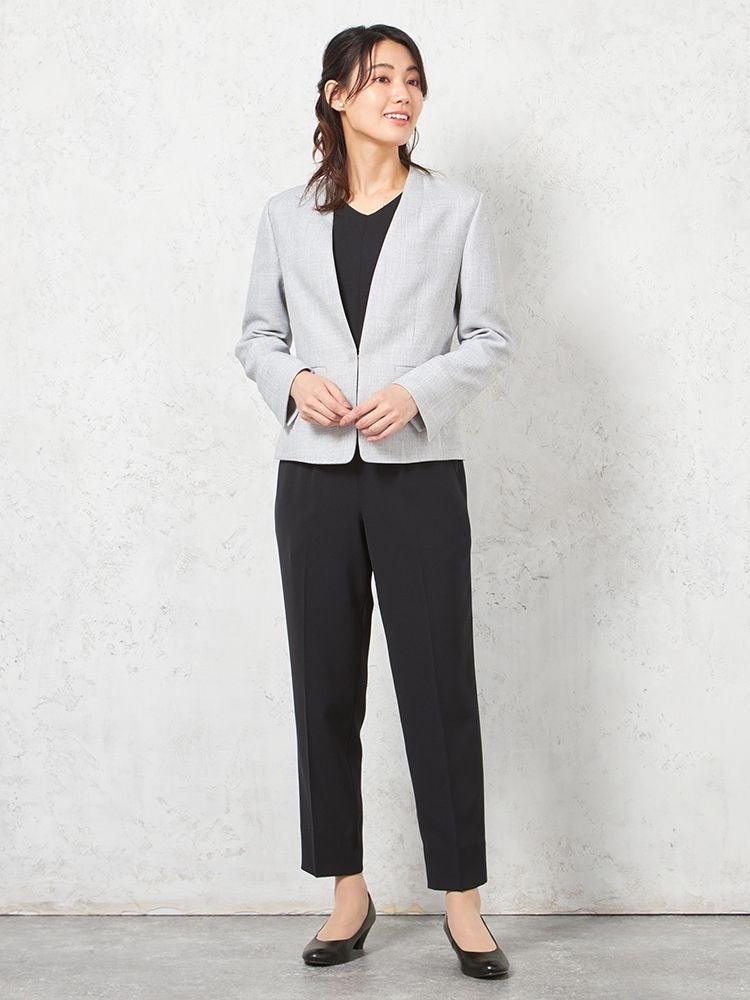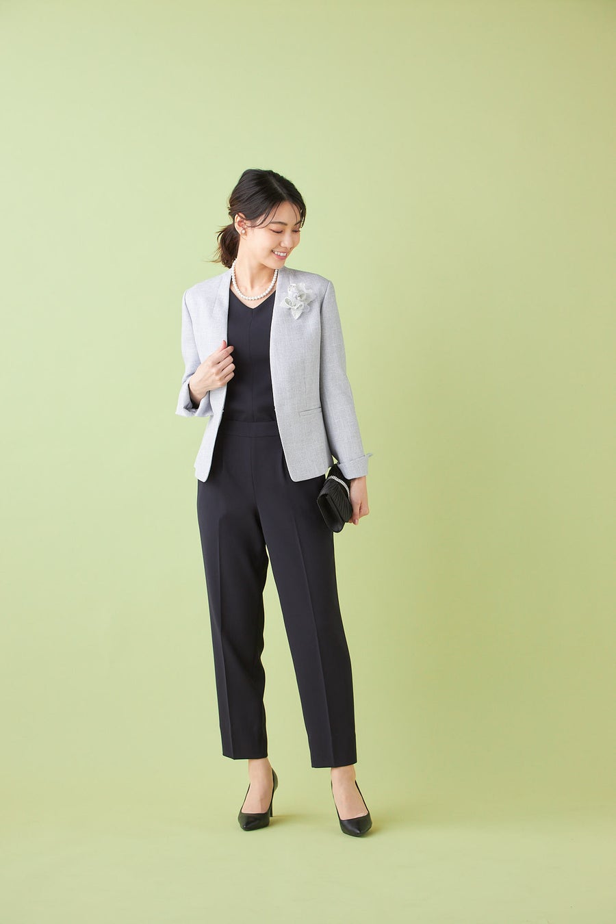 動きやすさや普段の着まわしやすさ、スタイリッシュさを重視する方にはパンツスタイルがおすすめです。すっきりとしたIラインがスラっと綺麗に見せてくれるブラウスとパンツのセットアップに、ノーカラーのジャケットがセットになったセレモニースーツです。ベーシックでビジネスシーンにも対応可能なセットアップスタイルとなっています。