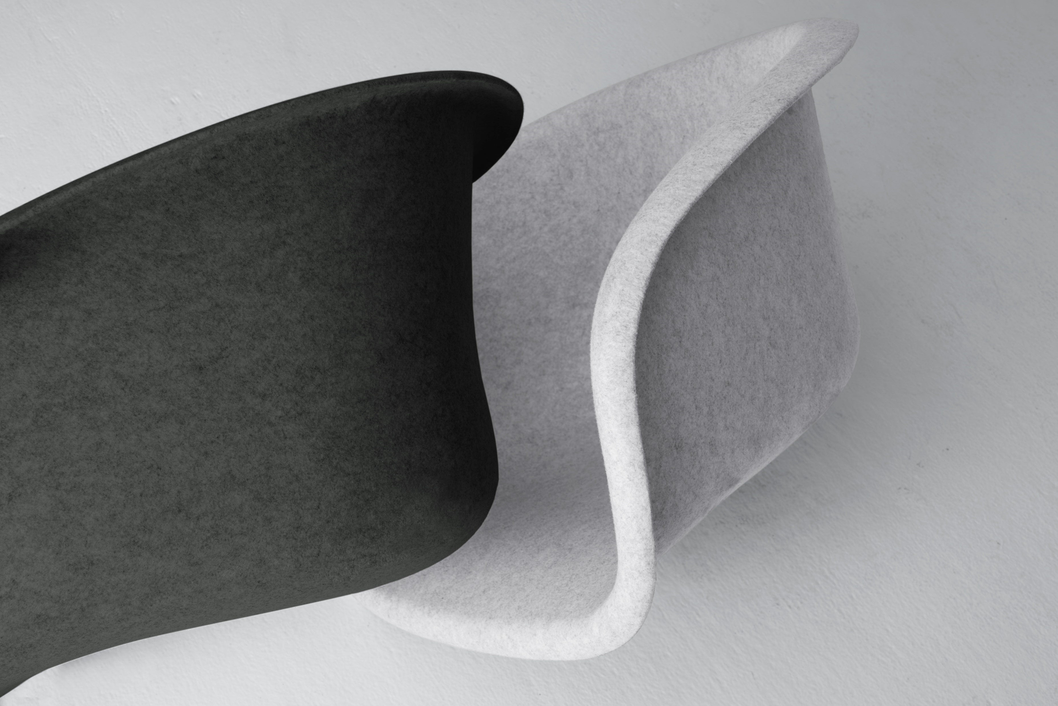 素材選定と製造プロセスの両面から環境負荷を低減。独自の成型技術を活かした曲線美とフェルトの質感で、オフィス内のワークスペース、ラウンジ、カフェエリアなど様々な空間を洗練された印象に演出