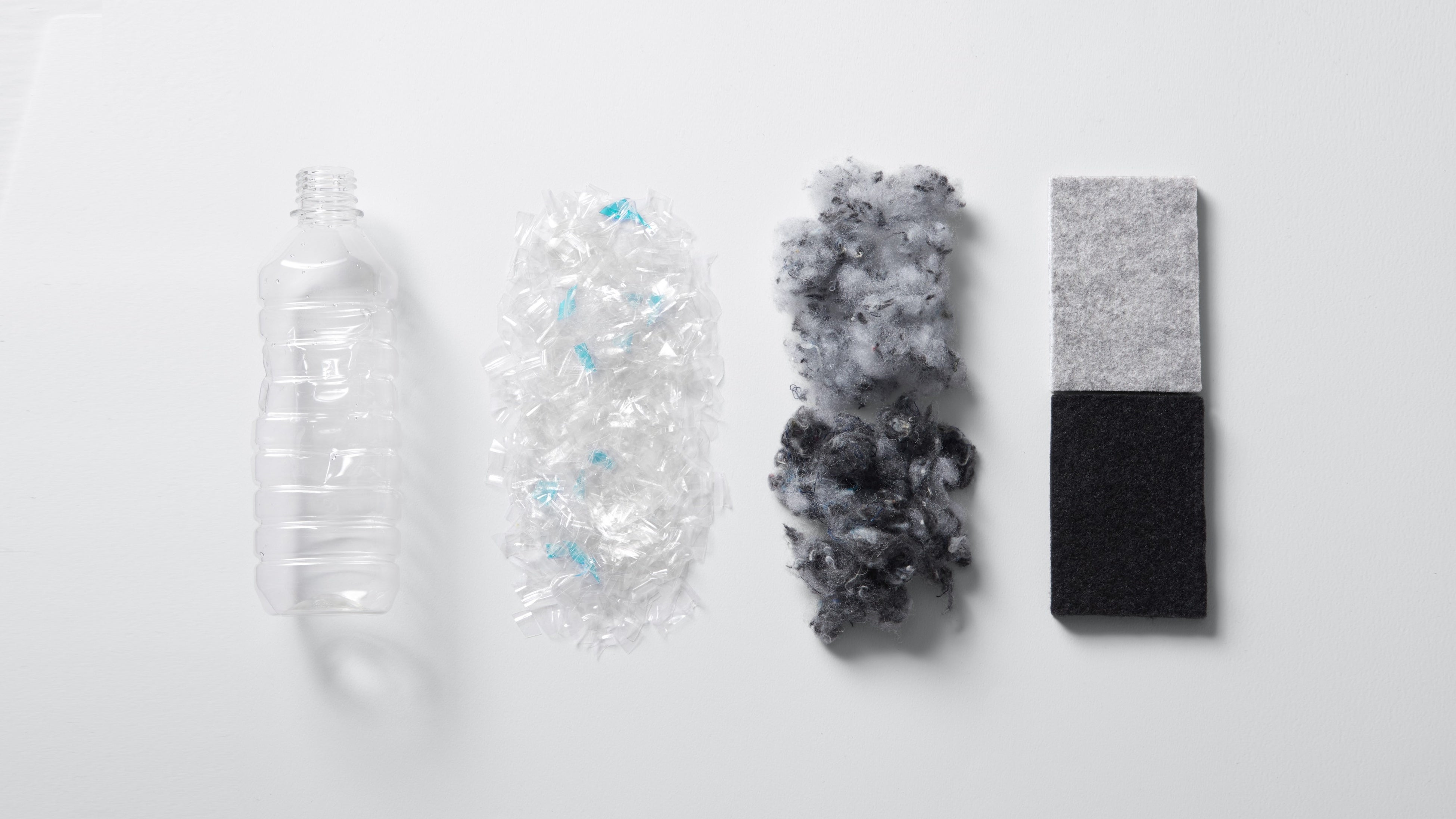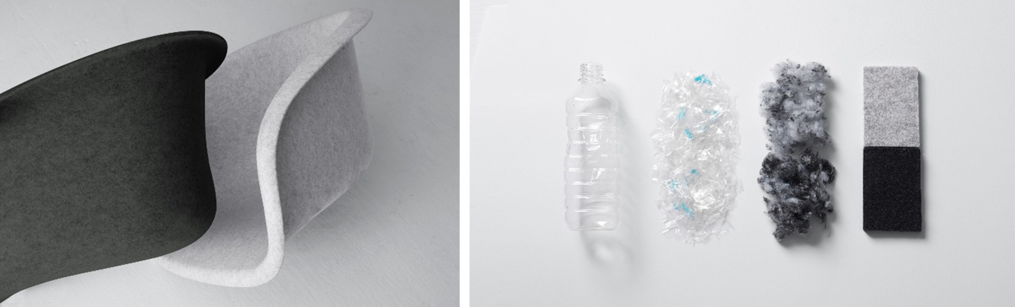 背座シェルには使用済みのペットボトルを回収、再資源化した繊維を約50%含むポリエステルフェルトを採用し、従来のプラスチックモールドによるチェアパーツと比べて製造エネルギーとCO2排出量を抑えました。座クッションにも製造過程や製品使用後に発生するウレタン端材を粉砕し再成型したチップウレタンを採用しています。