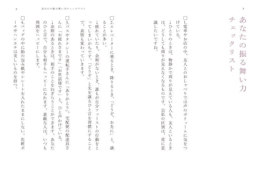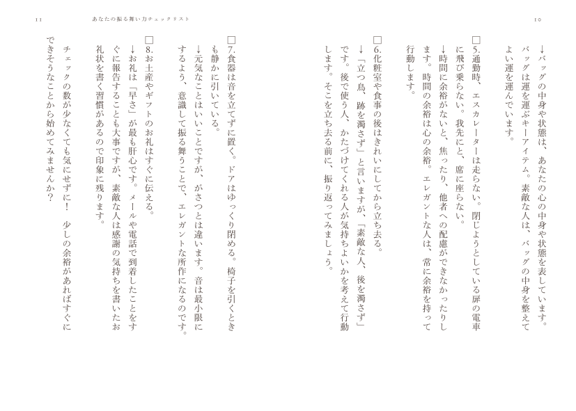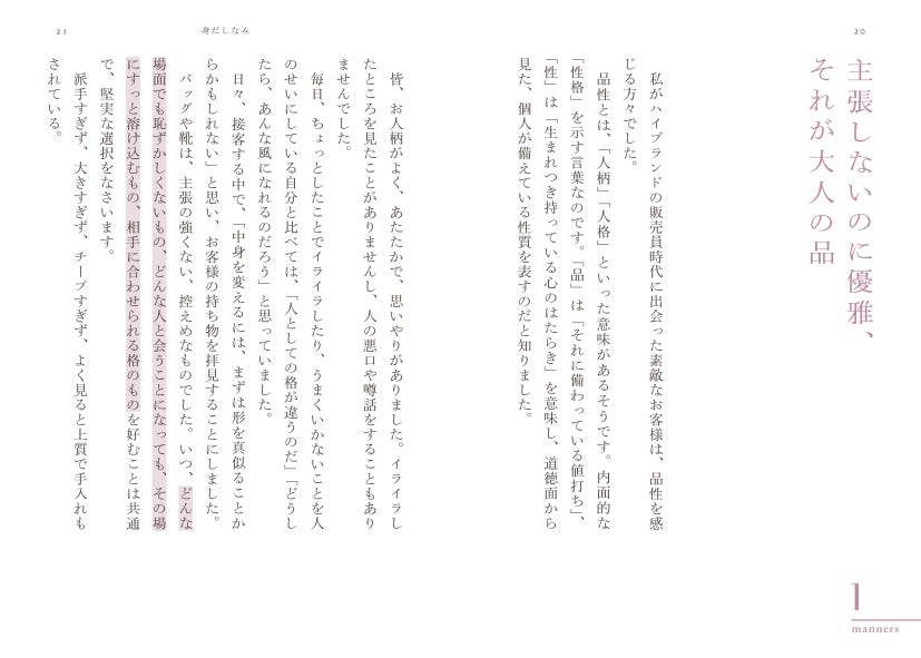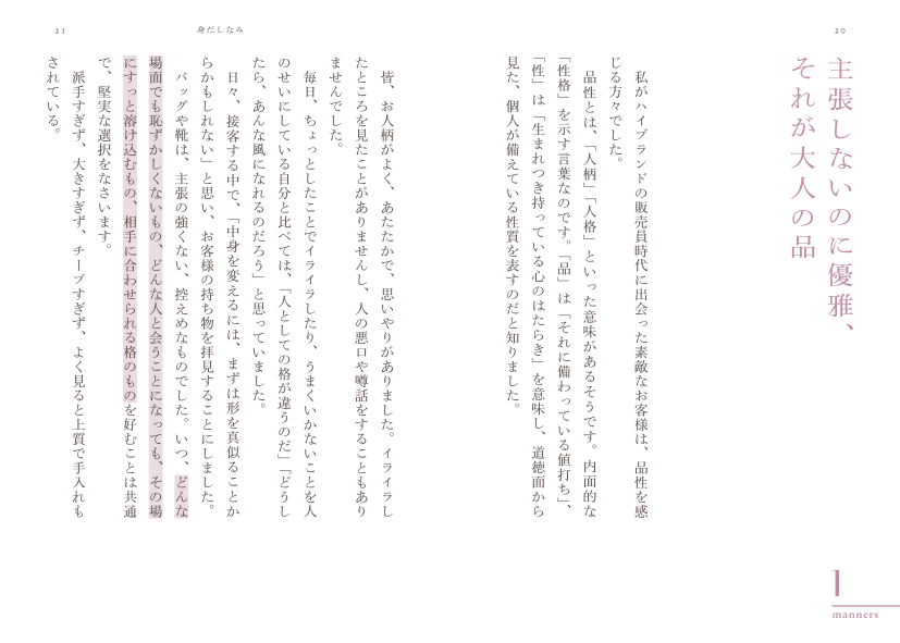 本書は「身だしなみ」「言葉遣い」「持ち物」「振る舞い」「気づかい」のパートごとに51項目、横田さんが実際に一流のお客様から学んだことを中心に、マナーの本質を伝えています。