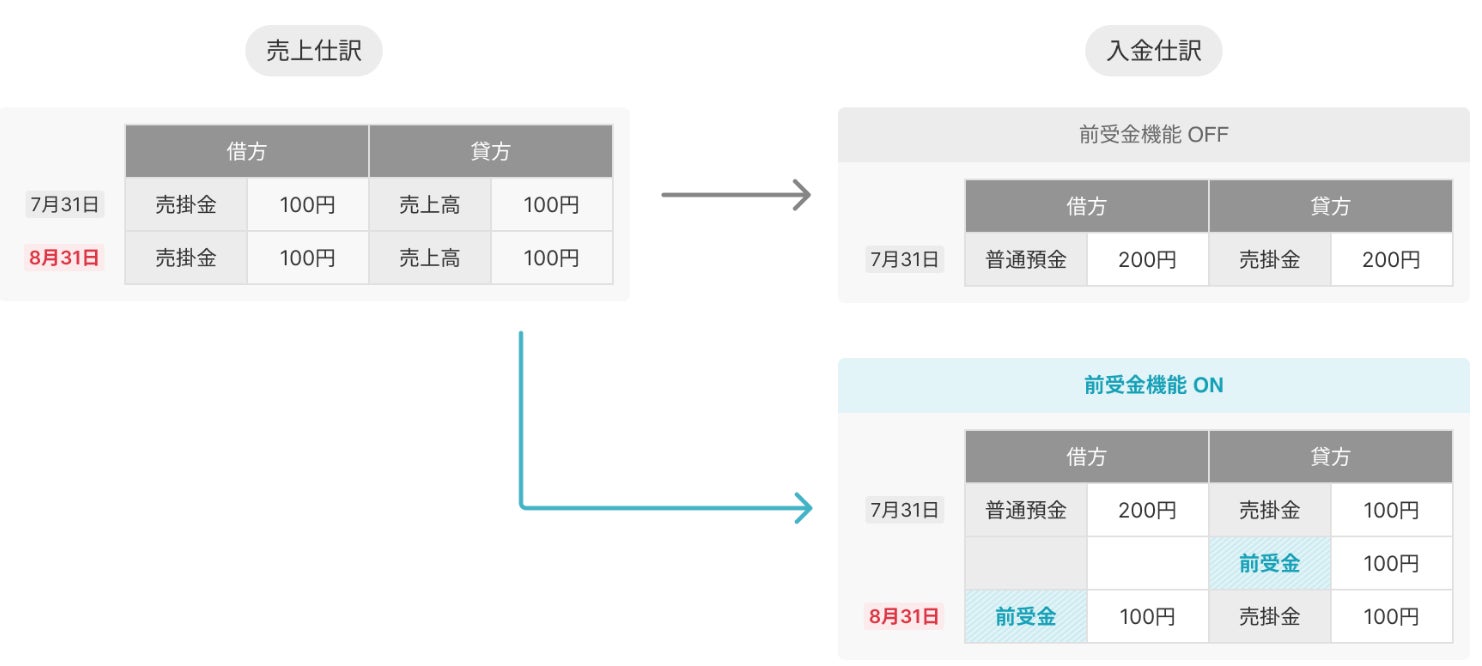 本機能では、入金月と売上計上月を比較し、入金月のほうが早い場合は、入金時点で前受金等を自動計上し、売上計上月にあわせて前受金等を取り崩す仕訳を自動で生成します。