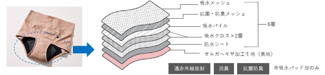①6層の立体パッド内蔵でスピード吸収&ニオイを防ぎ、肌をサラサラに保つ。約50~60mlの水分を吸水。