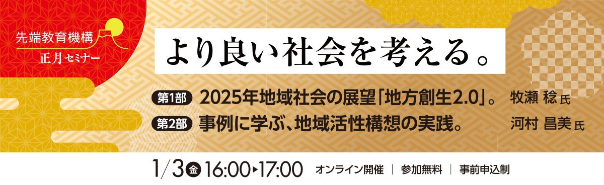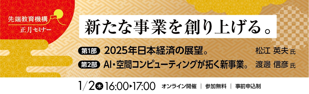 学校法人先端教育機構(東京都港区、理事長:東英弥)は新たな時代に向けた学びと成長をテーマに、2025年の展望を探る「お正月セミナー」を開催いたします。3日間にわたり、多彩なスピーカーと共に、組織・個人・地域の未来について考えるセッションをお届けします。2025年に向けた最新の知見や実践事例を通じ持続可能な成長を共に考えます。