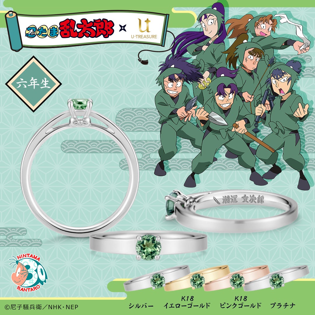【忍たま乱太郎】放送30年 メモリアルリング(指輪)2種類。五年生アイオライト、六年生グリーントルマリンをセンターストーンに。久々知兵助、潮江文次郎など11人から選んで内側に名前を刻印