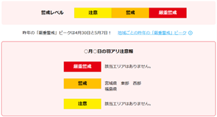■昨年の発生ピークを振り返る:昨年3,000件超のプロット地点や、地域別の警戒レベル発表実績(昨年は4月30日、5月7日がピーク)を網羅しています。