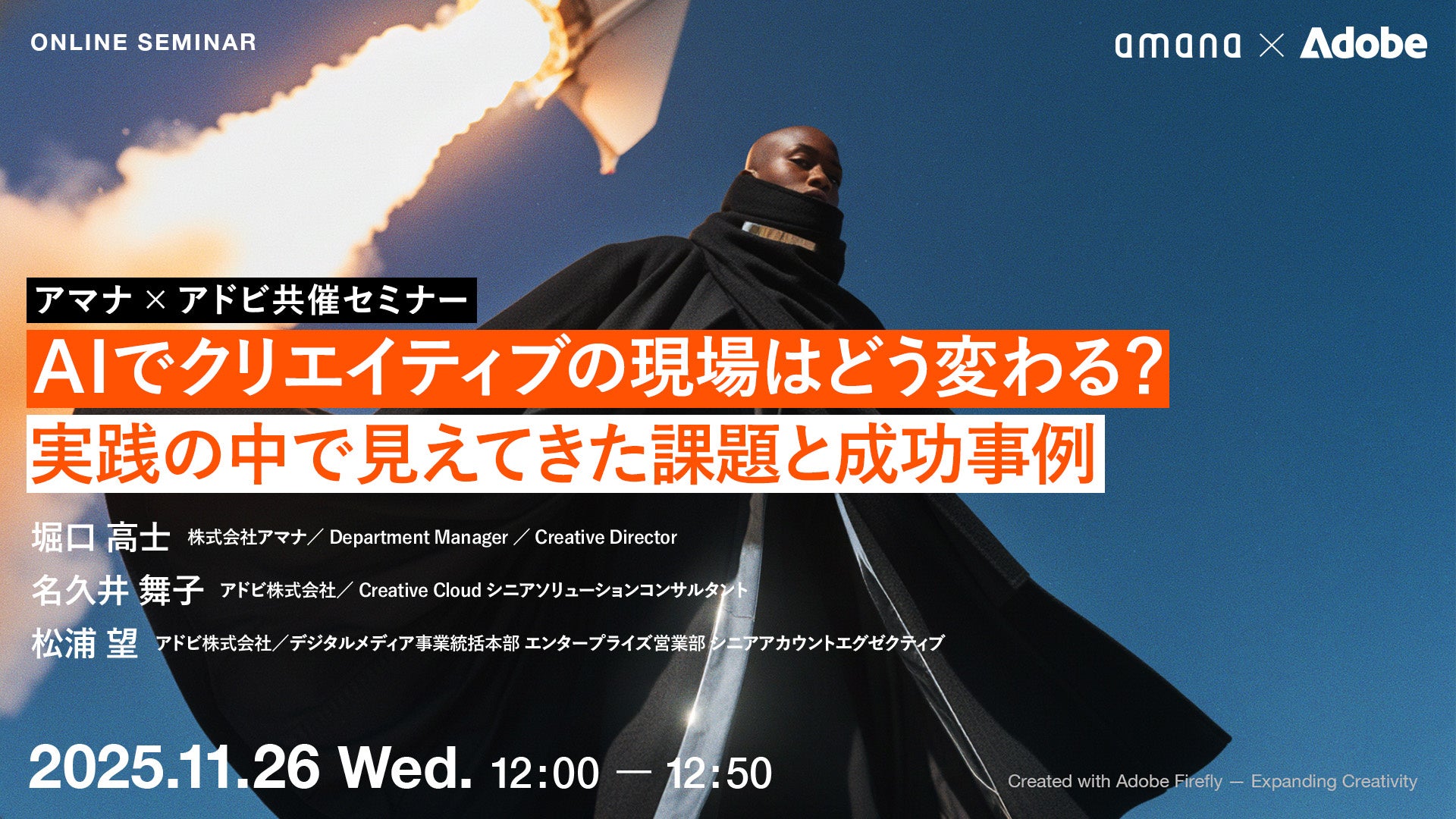 コミュニケーション変革をクリエイティブで実現する株式会社アマナ(本社:東京都品川区、代表取締役社長:金子剛章、以下「アマナ」)は、アドビ株式会社と共同で、2025年11月26日(水)、「AIでクリエイティブの現場はどう変わる?実践の中で見えてきた課題と成功事例」をテーマにオンラインセミナーを開催します。