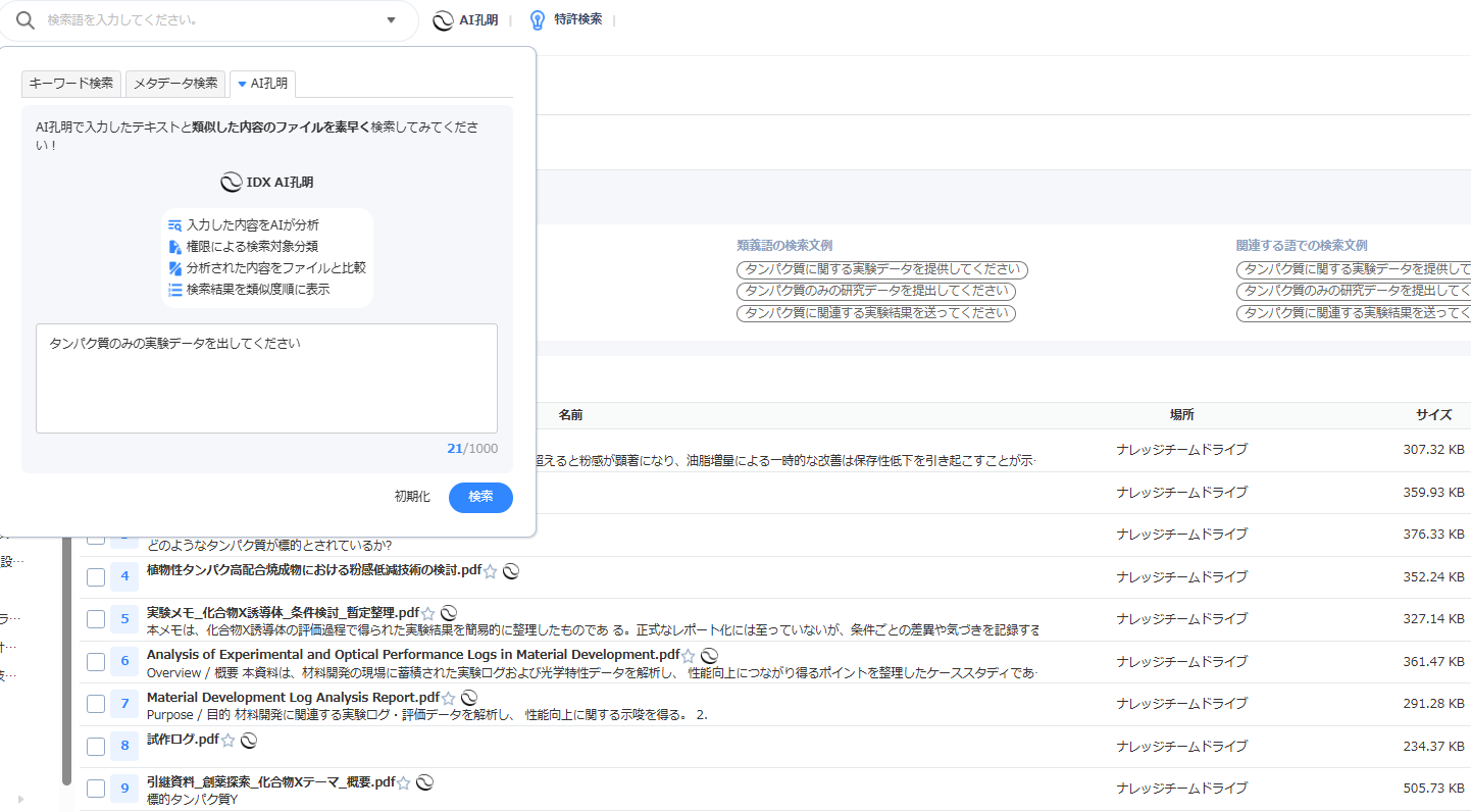 AI IPGenius on IDX は、研究ノート、実験記録、技術メモ、議事録などの非構造データを一元的に蓄積し、AIによる検索・要約・解析を可能にする知の資産化ナレッジベースである。
