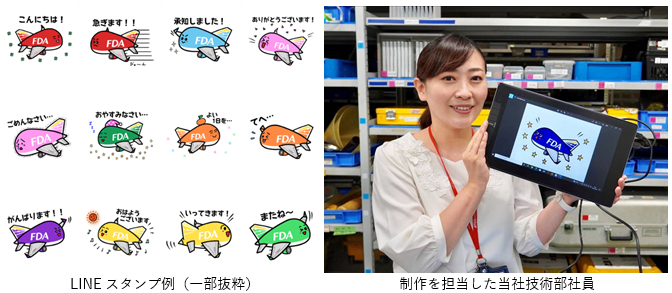 今回は、FDA公式LINEスタンプの「第二弾」と題し、当社の特徴でもある「マルチカラーの機体」をスタンプにしました。なお、今回については、航空機の安全維持のため整備作業における品質向上を受け持つ技術部門に所属している一般社員がデザインを担当しており、本年5月より販売している「第一弾」のLINEスタンプに引き続き、社内でイラストが得意な社員を制作に起用しております。