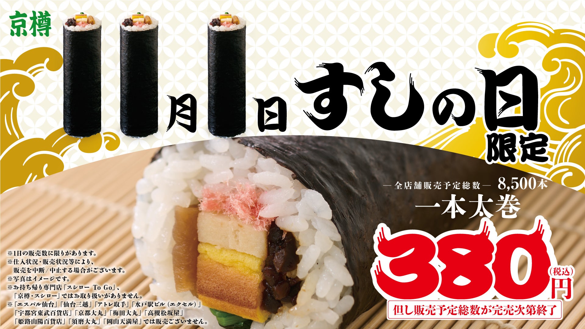 お持ち帰り鮨専門店「京樽」、11月1日(水)“すしの日”限定!「一本太巻」380円(税込)が登場!