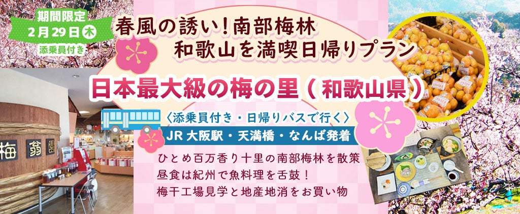 2月29日(木) お一人様11,500円!【和歌山県 みなべ】〈大阪駅・天満橋・なんば発着・添乗員付き〉春風の誘い!日本最大級の梅の里、南部梅林と紀州で魚料理を舌鼓!和歌山満喫日帰りプラン