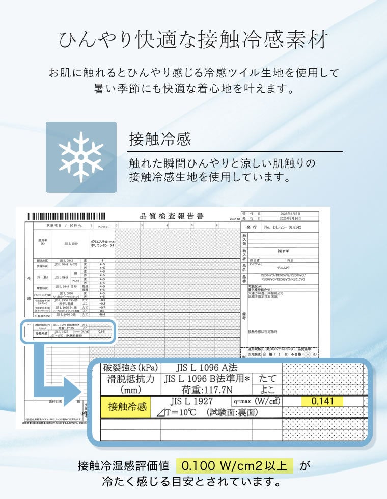 ひんやり接触冷感で涼しい、軽やかでさらりとした肌当たりの生地を採用。