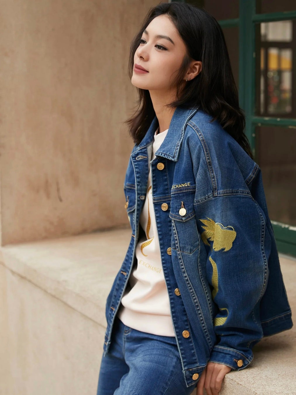 A|X アルマーニ エクスチェンジのアイコニックなアイテムのひとつであるデニムを用いたセットアップも登場。オーバーサイズシルエットのデニムジャケットは、エッセンシャルなスタイルでありながら、両袖に大胆なゴールドのドラゴン刺繍をあしらい、存在感のあるコーディネートが楽しめます。