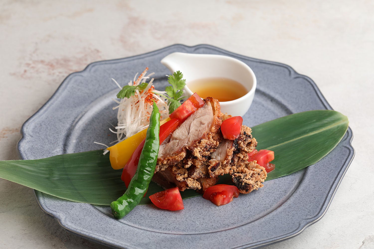 高知県大川村の特産、土佐はちきん地鶏のモモ肉を塩麹で漬け込み、ジューシーなから揚げにしました。スパイスが香る爽やかな味わいのから揚げに、野菜を添えてご提供します。