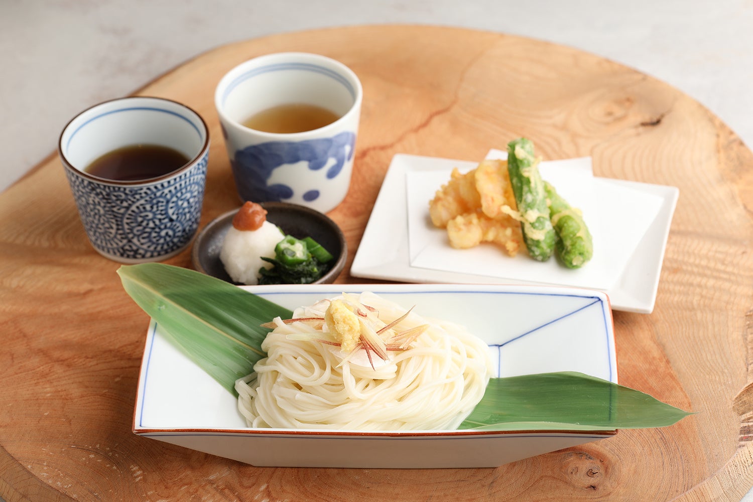 なめらかで喉ごしの良さが特徴の、秋田県横手市の斎藤製麺から直送の稲庭うどんを、暑い日々にぴったりの冷やしでご用意しました。梅おろしと生姜出汁の二種類のタレでお召し上がりください。
