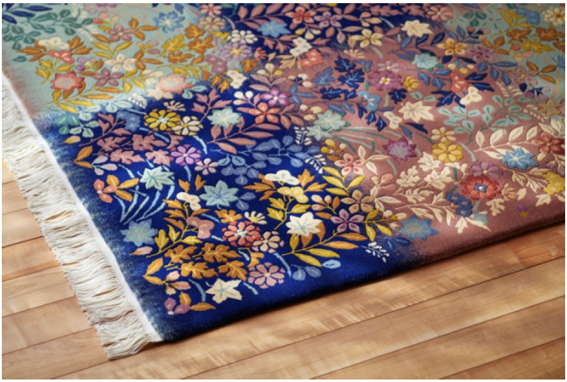 日本最⾼峰の品質を誇る山形緞通。大切に受け継がれてきた図案の古典柄「千秋(SENSYU)」は、能装束の柄をモチーフにしており、日本の秋の草花が織り込まれた優雅さと華やかさを感じさせる⼀枚です。