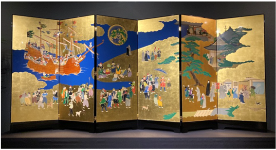 日本に来航したポルトガル船の上陸場⾯をモチーフとした、近世初期風俗画の⼀主題。南蛮人の色鮮やかな装いや装飾品、表情、動物など綿密な描写を、六曲の屏風にダイナミックな構図で配しています。⾦雲や色とりどりの漆を⽤いた豪華絢爛な作品で、⽊地製作から完成まで、実に4年もの歳月をかけた類稀な傑作です。