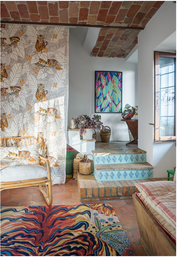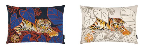 「フィスバ」の愛称で知られるクリスチャン・フィッシュバッハの新作ファブリック「DAWON(ダウォン)」。国際的に活躍するマレーシアのアーティスト、レベッカ・ダケット=ウィルキンソンが野⽣動物保護の観点から描いた⻁を、美しい刺繍などで表現しました。カーテンに適した光沢のあるリネンとコットンの混紡⽣地の上に、マラヤタイガーやトロピカルなバナナの葉や花々が、緻密な刺繍で色鮮やかに描かれています。
