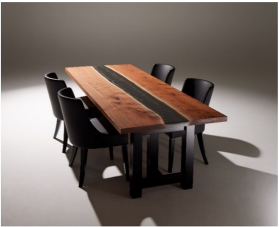 銘⽊の⼀枚板と植物由来のレジン(樹脂)を組み合わせた唯⼀無⼆のアートのような天板。⼀枚板の間にレジンを流し込む加⼯を施したものは、⽊部を陸地に、レジンを川に⾒⽴てて、“リバーテーブル”と呼ばれ、世界的に大きなムーブメントとなっています。