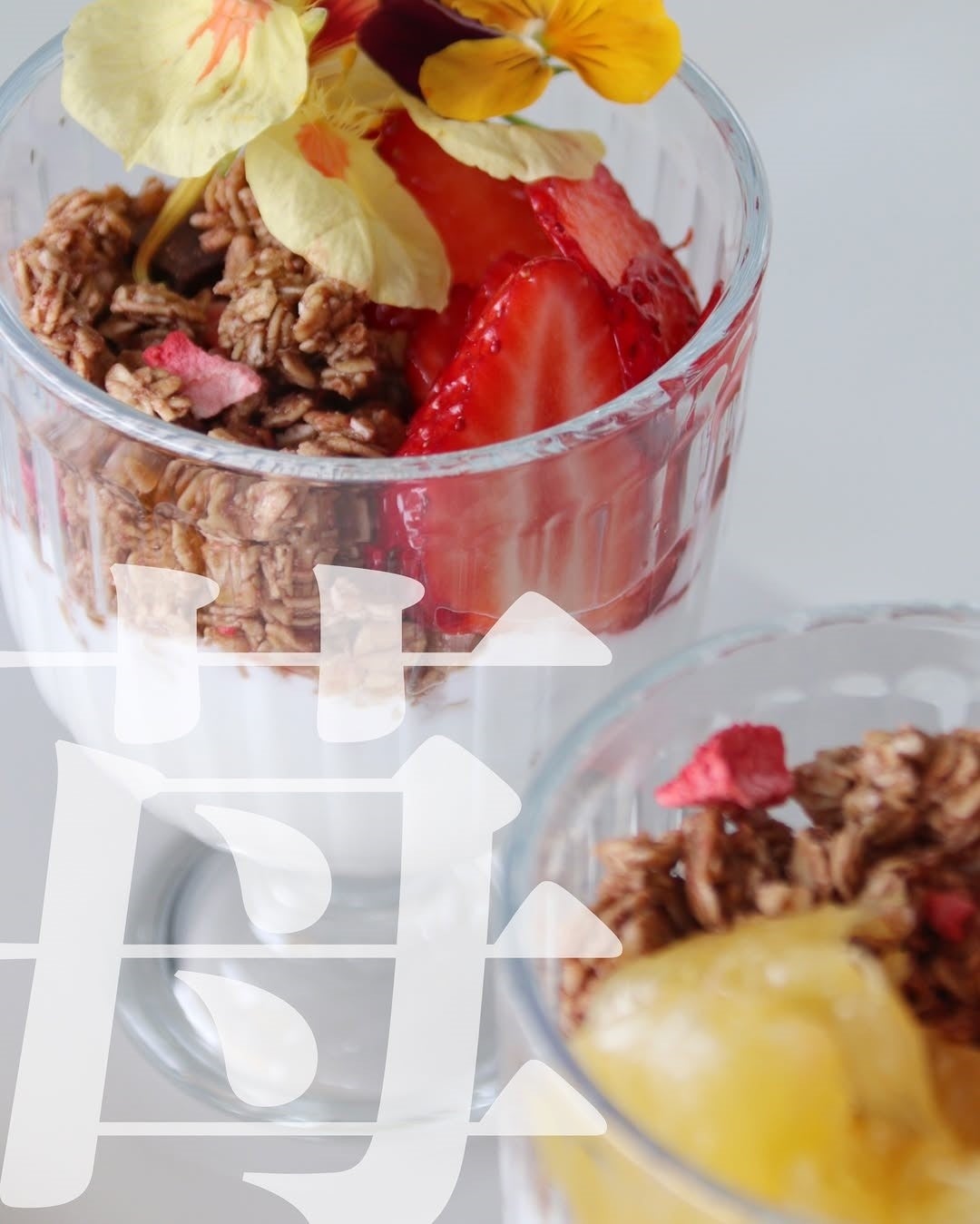 なめらかな手作りヨーグルトに、甘いいちごと、ほろっと香る甘夏。ほんのりグラノーラを添えて、お花を上にふわりと乗せました。朝にも、おやつにもぴったりなやさしい一皿です。